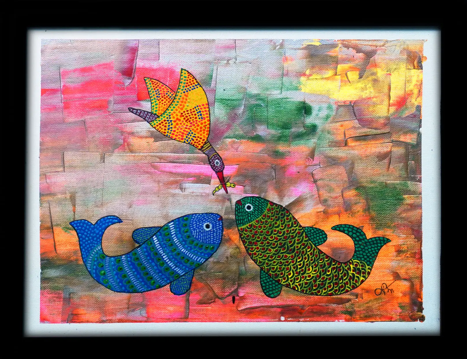 Is artwork mein Under-the-sea life ko abstract expressionism ke saath dikhaya gaya hai. Background mein bright, brush-stroked wash hai jismein pink, orange, green, aur yellow ke rough blocks hain. Is dynamic background ke saamne, do large, stylized fish hain – ek deep blue aur ek dark green – dono hi intricate Gond scale patterns se bhare hain. Upar se ek yellow-orange flying bird niche aakar unse interact kar raha hai. Yeh composition air aur water ke elements ka mel, aur vibrant colours mein Gond patterns ki adaptability dikhati hai.