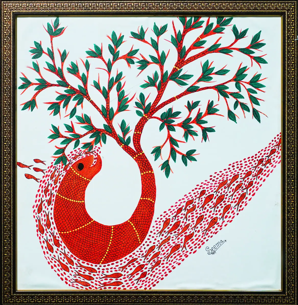 Yeh painting dynamism aur nature ke chakron (cycles) ko capture karti hai. Center mein ek vibrant red snake/dragon-like creature hai, jo curly tree trunk ki tarah upar jaa raha hai. Iska shareer yellow dots aur fine line patterns se bhara hua hai. Upar, yeh figure ek hari-bhari Tree of Life mein badal jaata hai, jismein dark green leaves aur red branches hain. Snake ke shareer ke charon taraf, red dots aur choti, red fish ki ek current hai, jo River of Life ya Urja ka Pravah (flow of energy) ko darshati hai. Yeh composition Prakriti mein Jeevan aur Mrityu ke aapas mein jude hona (interconnectedness of life and death) aur evolution ka shandaar prateek hai.