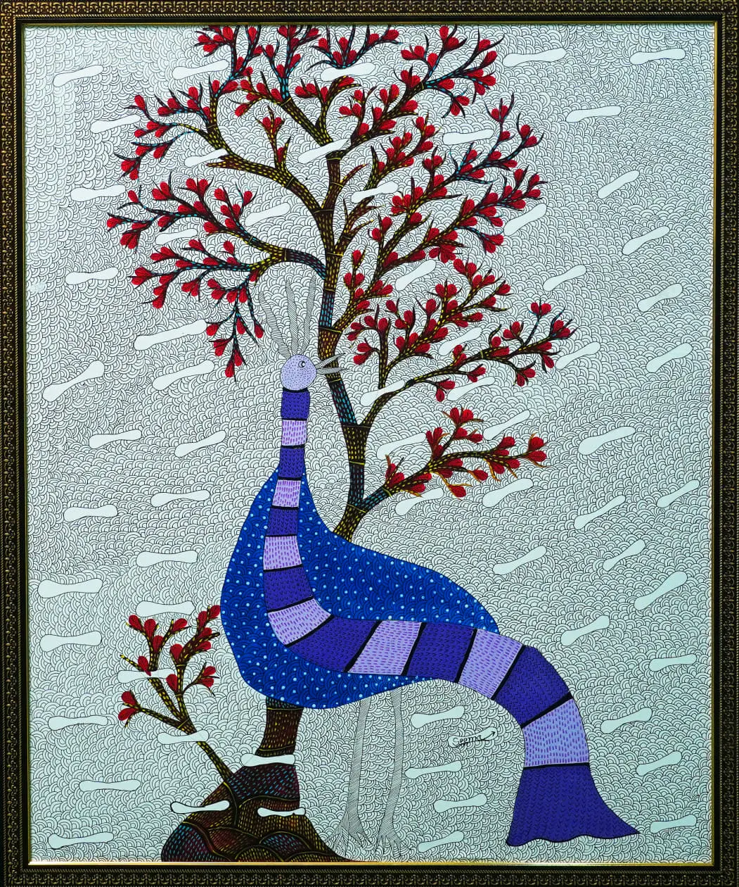 Ek sophisticated Gond artwork jismein ek Peacock Tree of Red Blossoms ke saath khada hai. Peacock deep blue aur lavender stripes aur patterns se saza hai, jo use majestic look dete hain. Background mein white cloud-like streaks ke saath dense, mesmerizing swirling line patterns hain, jo is painting ko ek dream-like, hypnotic texture dete hain. Tree ki dark, slender branches par vibrant red flowers/patte hain, jo passion aur jeevan ki shakti ko darshate hain. Yeh piece Peacock ki grace, nature ki beauty, aur high-level of intricate line work ko exhibit karta hai, making it a masterpiece of Gond technique.