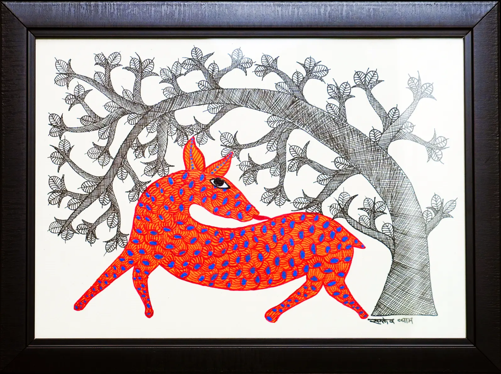 Ek warm aur endearing Gond painting jismein ek deer (hiran) ko ek large, sprawling, monochrome tree ke niche aaram karte hue dikhaya gaya hai. Tree ki branches detailed cross-hatching aur delicate leaves se bani hain, jo sirf black-and-white hain. Iske contrast mein, deer ka shareer vibrant orange-red colour ka hai, jiske upar chote blue ‘dash’ dots ka pattern hai. Yeh colour aur texture ka contrast deer ko focus mein laata hai. Deer ka pose peaceful aur graceful hai. Yeh artwork van (forest) ki shanti (peace), jeev jantuon ki saundarya (beauty of creatures), aur natural habitat ki importance ko dikhaati hai. Iski simplicity aur bold use of colour ise ghar ke liye ek aakarshak (attractive) piece banaati hai.