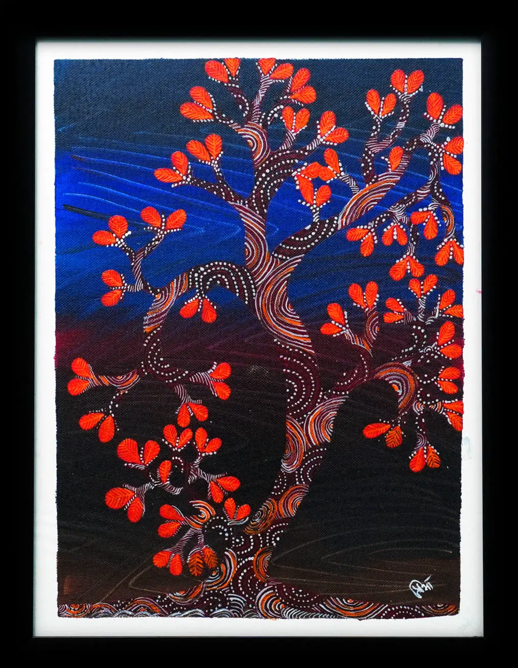 Yeh artwork Gond Tree of Life ki mystical interpretation hai. Tree ka trunk aur branches complex, concentric lines aur white dot patterns se bane hain, jo continuous energy aur growth ko darshate hain. Leaves ko vibrant, heart-shaped, fiery red colour mein banaya gaya hai, jo passion aur jeevan ki shakti ka prateek hain. Background ek dramatic contrast hai: deep blue aur black ka gradient, jo cosmic night sky ya gehre jungle ka mahol banata hai. Is painting mein vibrant colours aur minute detailing ka high contrast use kiya gaya hai, jo ise bhavya (grand) aur spiritual depth deta hai.